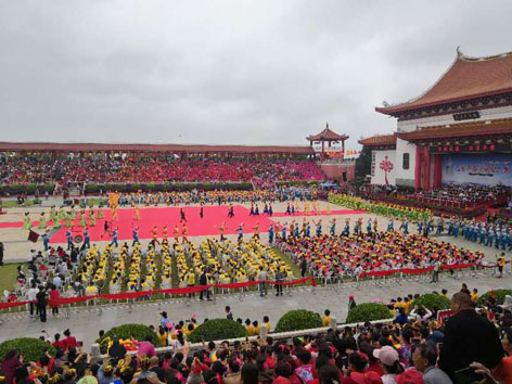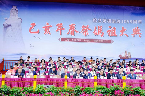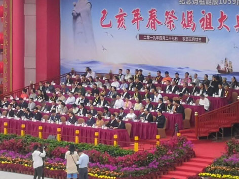紀(jì)念大會后,還舉行了己亥年春祭媽祖典禮等活動。來自臺灣云林北港朝天宮、高雄路竹天后宮等40家臺灣宮廟代表和香港、澳門地區(qū)媽祖信眾,以及阿根廷、泰國、越南、老撾、馬來西亞等國家的媽祖信眾代表近萬人歡聚圣地,同沐福澤,共慶圣誕。9時30分,農(nóng)歷己亥年春祭媽祖典禮開始,可納2萬人的湄洲島天后宮廣場座無虛席,禮臺中央,媽祖金身端莊肅穆,三獻(xiàn)樂舞畢,8條25米長的彩色巨幅綢帶象征各國民心匯聚的“海上絲綢之路”,涌向媽祖金身,寓意海洋文化與媽祖文化完美融合。旌鼓禮炮聲中,海內(nèi)外信眾依古制三跪九叩,同謁媽祖,祈愿兩岸和平,民族昌盛,絲路復(fù)興。為期六天的紀(jì)念媽祖誕辰活動期間,來自各地的120支民俗表演隊4500多人輪番上陣,為海內(nèi)外媽祖信眾、游客獻(xiàn)上一場精彩紛呈的文化盛宴。