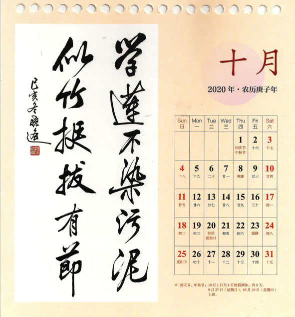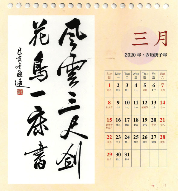 年末歲初,筆者收到了姚國培新出的2020年賀歲掛歷。這是一本設計新穎、制作精美、內容高雅、作品風格獨樹一幟的書法掛歷,用銅版紙印刷,每一幅作品都由姚國培自己創作、設計。