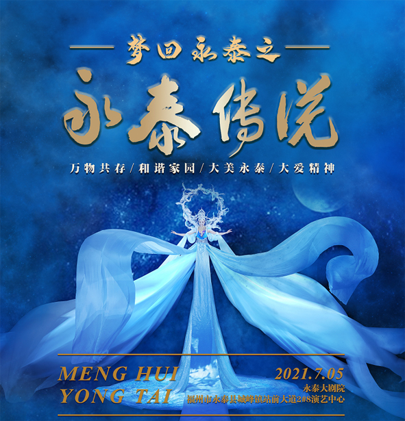 《夢(mèng)回永泰之永泰傳說》由永泰縣政府聯(lián)合華盛文化傳媒有限公司共同打造。該劇目將永泰縣最具代表性的家文化、神話傳說、民風(fēng)民俗等作為創(chuàng)作核心,圍繞“夢(mèng)起海上絲路,打造東南明珠;傳承兩岸文明,演繹中國盛典”的定位,以當(dāng)?shù)丶矣鲬魰缘膹埵ゾ齻髡f為創(chuàng)作主線,講述張圣君度化生靈、救濟(jì)眾生的故事,構(gòu)筑了一個(gè)夢(mèng)幻而絢麗的神話意境,是一部具有高度思想性和藝術(shù)性的舞臺(tái)精品力作。全劇以“萬物共存、和諧家園、大美永泰、大愛精神”為主要思想,將永泰的人文情懷、歷史傳說、大美山水等特色融入其中。由青云山開篇,引入母親河大樟溪,并融入“千年古樹”“百年莊寨”“養(yǎng)生溫泉”等永泰文化,彰顯了永泰歷史長河中的璀璨記憶。