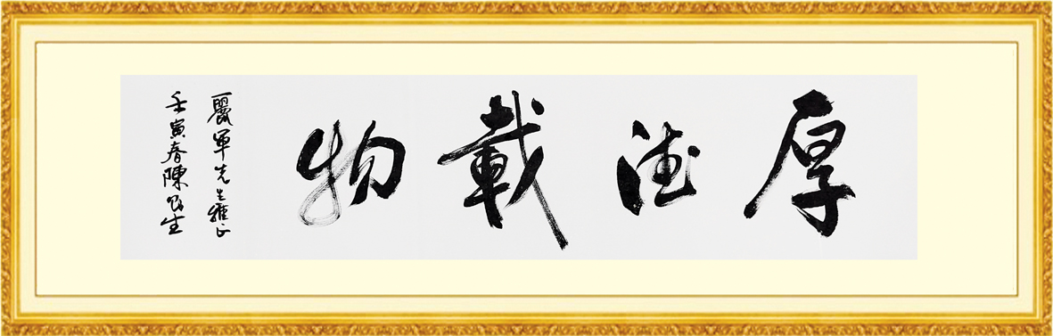 書法家的主題往往都有豐富的文化內涵,其言簡意賅,字意深遠,富有哲理。陳則生的“厚德載物”“道法自然”書法作品也不另外。“厚德載物”是華夏民族精神的重要內涵的一種表達。該詞出自《易傳》的“天行健,君子以自強不息;地勢坤,君子以厚德載物”一語,意思是指君子的品德應如大地般厚實可以承載萬物。自強不息、厚德載物是為人們普遍認同的傳統民族精神。