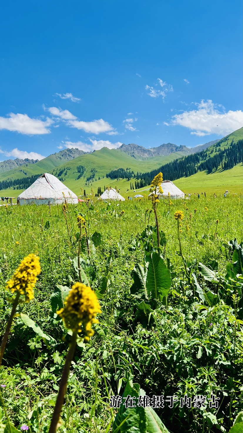 越野車門一開,撲面而來是翠綠深邃的寫意:沃野,洼地,丘陵與小山,盡是一望無垠的綠海,投身其中就仿佛投入母親的懷袍,氈房點點的蒙古包上,五彩旗在迎風(fēng)搖曳,我知道,那是母親在揮舞著歡迎的雙手,你來啦,她便無憂!遙望天空,是原始的湛藍(lán)、清澈,白云朵朵不時在不遠(yuǎn)山頂?shù)牟菁馍匣瑁虺蓤F、或成陣、或單飛,有時就像吳剛與嫦娥在舞袖翩躚、在動情表白,生動、率真、熱情,讓人無法抗拒,我知道,這種詩意,是上蒼垂青,專為草原打造的一種悠揚;抬頭遠(yuǎn)眺,靈性的牛羊,一群群,一簇簇,或站,或臥,或嬉戲,或低頭吃草,偶爾可見的牧人,騎著摩托在放歌,聲音嘹亮高亢,又透著悲哀與滄涼,我知道,那是草原人對生命的思考和追問,對草原由衷的敬畏與感恩,赤子般的情懷,幾天來司機兼導(dǎo)游的幾位蒙族兄弟就是最好例證,唱歌喝酒,粗獷而豪邁,卻十分愛惜草原上的每一朵花,每一片草,遇游人摘花,總會上前勸服,言語委婉而堅定,遇路窄交會車,從不肯碾壓草地而過,總是主動把車倒退很遠(yuǎn),直到寬處。是呀,草原是草原人的,也是我們的!于是,草原上獨自漫步的我,也變得是手足無措,舒緩的步態(tài)逐漸持重起來,生怕一失足而糟蹋那些美麗的生靈!
