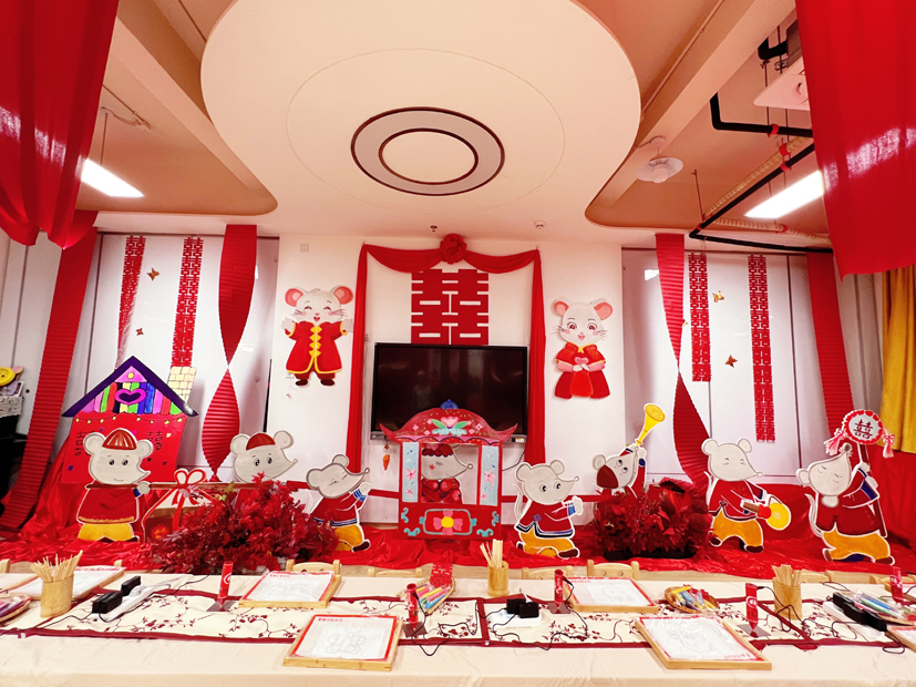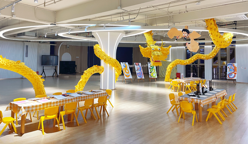 看,哪里來的鑼鼓聲,這么熱鬧,原來是小孩子喜氣洋洋,抬起了花轎。這個(gè)區(qū)域非常熱鬧,紅紅火火。抬花轎這個(gè)游戲出自《老鼠嫁女》繪本。由小朋友來演繹,有一番特別的滋味。有一個(gè)小朋友說,這是她第一次抬轎子,她的感受是要合作,轎子才會(huì)穩(wěn)。四個(gè)人抬轎子,一定要齊心協(xié)力,才能夠穩(wěn)當(dāng),小朋友在游戲中學(xué)到了知識(shí)。那么,這么有趣的小游戲是怎么設(shè)計(jì)出來的?據(jù)幼兒園老師胡夢佳介紹,平時(shí)和小朋友一起學(xué)習(xí)的時(shí)候,發(fā)現(xiàn)小孩子對《老鼠嫁女》這個(gè)繪本非常感興趣,里面有喜字,還有花轎,都是小孩子非常感興趣的,于是我們剛好通過六一繪本游樂活動(dòng),就結(jié)合起來了,讓孩子們感受傳統(tǒng)的嫁娶儀式,經(jīng)典與童趣結(jié)合在一起,感覺非常棒!在“畫龍點(diǎn)睛”尋龍記游園館內(nèi),一條金燦燦的祥龍吸引住了小朋友,里面所有的內(nèi)容都與龍有關(guān)。小朋友手中拿的也都是與龍有關(guān)的各種手工作品,有水墨畫龍的扇子,有拓印著龍的圖案的手工布袋,還有這個(gè)五顏六色的手工祥龍等等。