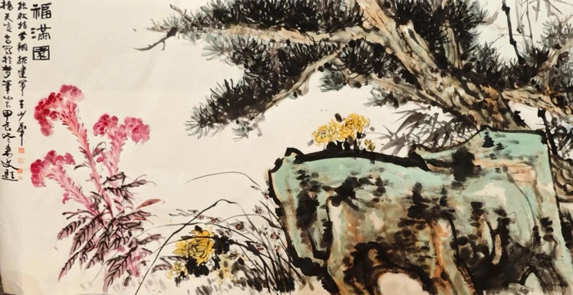 王來文、張秋桔、方翔、孫建軍、王少華、楊天生等共同創作了8尺畫作《福滿園》。