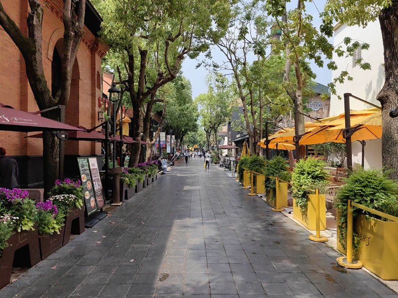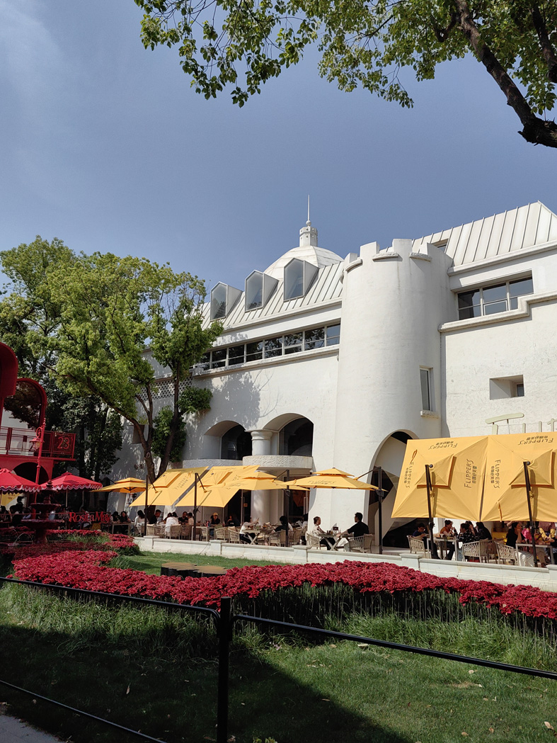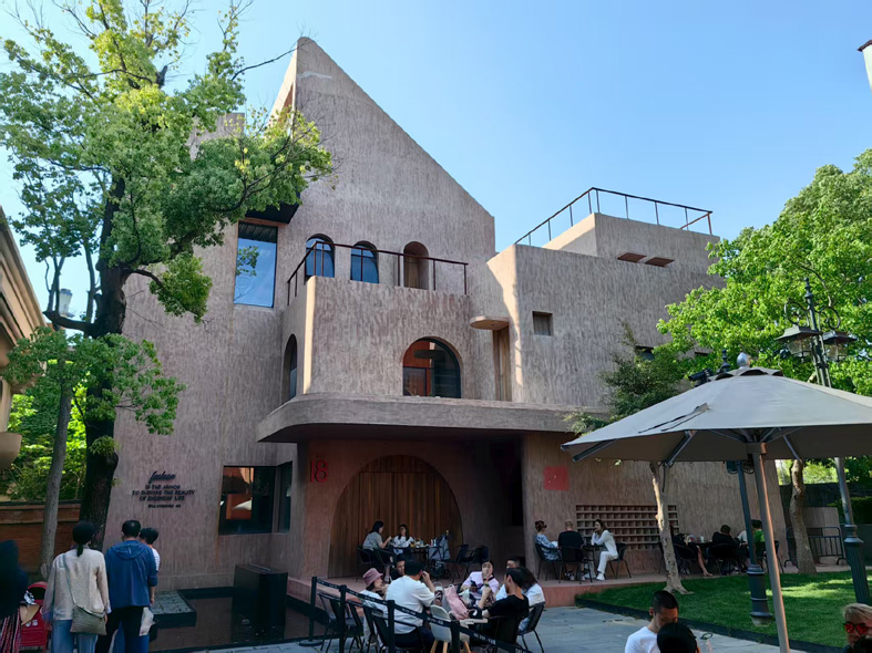 走近EKA•天物,仿佛游走在中世紀歐洲小鎮的夢幻場景中:紅磚砌成的北歐城堡與地中海式的白墻藍窗相鄰,集裝箱堆疊而成的極簡小樓與石庫門青瓦遙遙相望;爬山虎從斑駁的水泥墻裂隙里探出,纏繞著新嵌的銅制門廊;此外,還有RositaMay、Peet'sCoffee、LENBACH等數十家帶有英文標識的國外高端品牌門店。