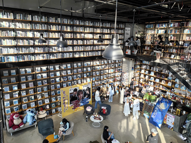 我慕名來到天物空間的“城市不眠”書店。顧名思義,這是一家24小時全天候營業的書店,上下兩層采用鋼構玻璃設計,視野開闊且明亮通透。店內的書架以DNA雙螺旋結構盤旋上升,書脊的斑斕色塊在鏡面天花板的映照下無限延伸,這里有序擺放的兩萬余冊圖書,早已成為每天數萬名游客的精神食糧。