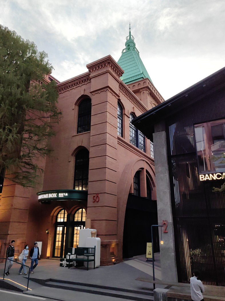 我們走出書店,來到EKA•天物銅堡。國善已在此等候,見我們到來,他介紹說:“這個社區歷史悠久,有著三重年輪——1869年海關工廠的基石,上海航海儀器廠的齒輪,新時代的新模樣”。抬眼望去,銅堡的拱形金屬穹頂將天光濾成了柔和的銅綠色。這座由廢棄車棚改造的全銅建筑,如潛水艇浮于鏡面水池,池底鋪設的錨鏈紋地磚,清晰倒映出銹鐵梁與玻璃幕墻交織的疊影。步入銅堡內部,猶如進入科幻世界,這里曾舉辦過著名的路特斯電車發布會,當下正在開展奧地利詩樂眼鏡(ATELIERNEXT)品牌展示活動。