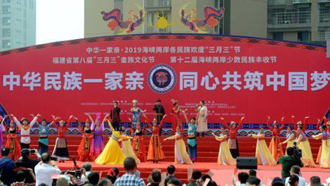 4月7日,“中華一家親•2019海峽兩岸各民族歡度‘三月三’節暨福建省第八屆‘三月三’畬族文化節•第十二屆海峽兩岸少數民族豐收節”在漳州舉行,海峽兩岸各民族共同歡慶“三月三”,暢敘兩岸情。在漳浦縣城的主會場,表演者身著鳳凰裝,梳著龍船髻,頭戴鳳冠,圖案花團錦簇、溢彩流光,顯示出鮮明的民族藝術特色。一曲《歌唱畬族三月三》唱響畬族風情,拉開文化節文藝演出帷幕,現場載歌載舞一片歡聲笑語。“三月三”文化節不僅有歌舞升平,上演一場“視聽盛宴”,也有特色美食,給參會人員帶來口福無限。糯米糍、烏米飯、咸餅等特色小吃讓人愛不釋手,黑豆酒、橄欖酒、油柑酒、荔枝酒等特色酒水令人垂涎欲滴,還有咸芥菜、酸筍、咸瓜等留住了游客的腳步。“三月三”的舉辦,將進一步掀起兩岸交流合作的熱潮。