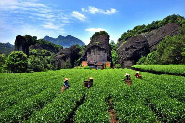 在我國東南部的武夷山,氣候溫和,冬暖夏涼,年平均溫度在攝氏18~18.5度之間;雨量充沛,年雨量2000毫米左右。山峰巖壑之間,有幽澗流泉。山間常年云霧彌漫,年平均相對濕度在80%左右,非常適宜種茶。正如沈涵《謝王適庵惠武夷茶詩》云:“香含玉女峰頭露,潤滯珠簾洞口云。”武夷山茶園大部分在巖壑幽澗之中,“九曲溪流,三十六峰,七十二洞,九十九巖”,日照較短,更無風害,優越的自然條件孕育出武夷巖茶獨特的韻味,香遠八方。