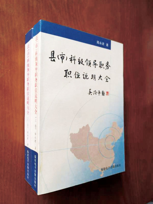 2001年,陸永建先生的專著《縣(市)科級領導職務職位說明大全》(上下卷)由福建電子音像出版社出版了,時任全國人大常委會副委員長吳階平親自題寫了書名。近20年過去,重新閱讀該書,那撲面而來的創新氣息還是那么濃厚。更讓人驚奇的是,作為一本研究縣(市)科級領導職務職位說明的專著,自從陸永建開山之后,竟成一枝獨秀,無出其右,其學術價值和社會價值更是經得起時間的檢驗,尤顯珍貴。”
