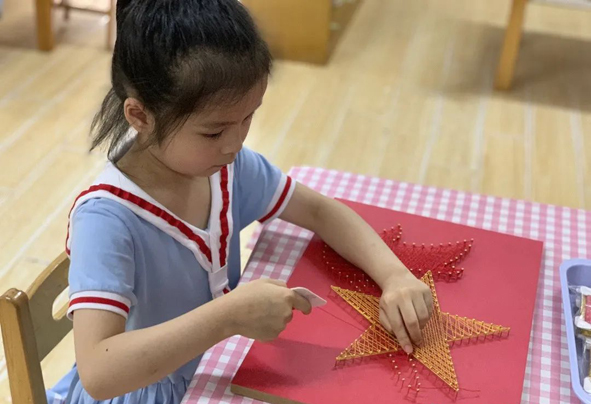 展示區(qū)里開展一分鐘系紅領巾、隊徽拼拼樂,隊前知識競賽、釘板畫等豐富的隊前區(qū)域游戲。