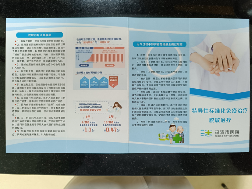 福清市醫(yī)院耳鼻咽喉科變態(tài)反應(yīng)室建于2008年至今已14年,開(kāi)展了舌下免疫治療。在這基礎(chǔ)上,2021年以培育建科的形式成立了“過(guò)敏反應(yīng)中心”,以耳鼻咽喉變態(tài)反應(yīng)、呼吸變態(tài)反應(yīng)、皮膚變態(tài)反應(yīng)、小兒變態(tài)反應(yīng)等多個(gè)亞專業(yè)學(xué)科進(jìn)行聯(lián)合診療。同年被列為“中國(guó)過(guò)敏學(xué)科優(yōu)秀核心團(tuán)隊(duì)建設(shè)單位”,并加入了以中華預(yù)防醫(yī)學(xué)會(huì)過(guò)敏病預(yù)防與控制專業(yè)委員會(huì)為指導(dǎo)單位發(fā)起的“福建省兒童過(guò)敏性疾病專科聯(lián)盟”,是福州市醫(yī)學(xué)會(huì)變態(tài)反應(yīng)學(xué)分會(huì)的掛靠單位。現(xiàn)科室建有獨(dú)立實(shí)驗(yàn)室,配備國(guó)際“金標(biāo)準(zhǔn)”的賽默飛Phadia全自動(dòng)體外過(guò)敏原檢測(cè)系統(tǒng)、皮膚點(diǎn)刺體內(nèi)檢測(cè)、肺功能、心電監(jiān)測(cè)儀、電子鼻-鼻咽喉鏡等先進(jìn)儀器設(shè)備,進(jìn)行標(biāo)準(zhǔn)化特異性免疫治療、室內(nèi)外過(guò)敏原環(huán)境監(jiān)測(cè)等.過(guò)敏反應(yīng)中心開(kāi)展的皮下特異性免疫治療(即脫敏治療)是世界衛(wèi)生組織認(rèn)可的唯一可能改變過(guò)敏性疾病自然進(jìn)程的對(duì)因治療方法,這種療法還能預(yù)防新發(fā)的過(guò)敏原,對(duì)于兒童而言還可以預(yù)防過(guò)敏性鼻炎進(jìn)展為過(guò)敏性哮喘,是廣大過(guò)敏性疾病患者的福音。