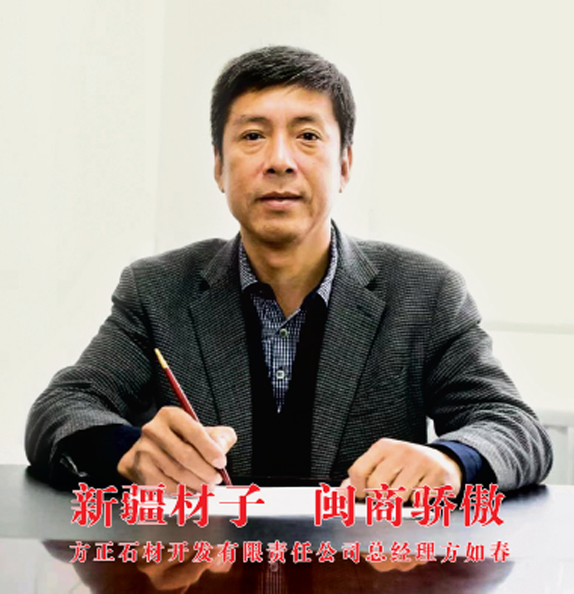 他,白手起家,踏平坎坷;他,嚴(yán)謹(jǐn)務(wù)實(shí),一絲不茍;他,敢于“異想天開”,敢于推陳出新,敢于挑戰(zhàn)不可能;他,做事用心,做人用情,做事如水,做人如山。 他是一位性格堅強(qiáng),具有強(qiáng)烈事業(yè)心、責(zé)任感和奉獻(xiàn)精神的閩商,在長期的企業(yè)經(jīng)營中,團(tuán)結(jié)帶領(lǐng)公司全體員工敢于創(chuàng)新創(chuàng)業(yè)創(chuàng)效;他以過人的膽識和魄力,開啟了企業(yè)新天地,以寬廣的胸懷和格局,包容、隱忍,把企業(yè)做大做強(qiáng)。他就是奇臺縣方正石材開發(fā)有限責(zé)任公司總經(jīng)理方如春。作為民營企業(yè)的掌舵者,他堅持以一顆勤勞致富的紅心、一顆回報社會的愛心、一顆堅守實(shí)業(yè)的初心、一顆關(guān)懷他人的善心。